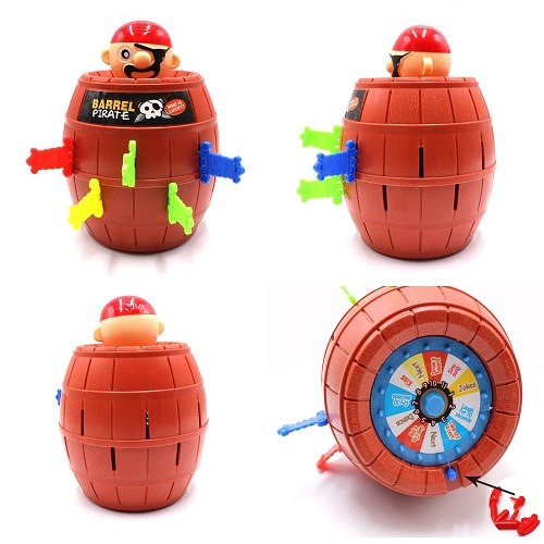 در این بازی ۴ رنگ شمشیر وجود دارد که در اختیار ۴ بازیکن قرار می گیرد و هر بازیکن با شمشیرش به نقطه هدف می زند و این چنین به نوبت هر بازیکن منتظر می ماند تا ضربه اشتباه هدف بخورد و پیروز مسابقه شود. البته نکته مهم این است که با مشخص شدن برنده بازی به انتها نمی رسد و آن موقع هم باید گردونک چرخانده شود تا با هر بار قرار دادن عروسک دزد دریایی داخل بشکه محل پرتاب به طور شانسی تغییر داده شود و این بار هم کسی نداند کدام شیار به هدف می خورد. این بازی تاثیر بسیار زیادی بر روی رشد حرکتی و گفتاری کودکان شما خواهد گذاشت.